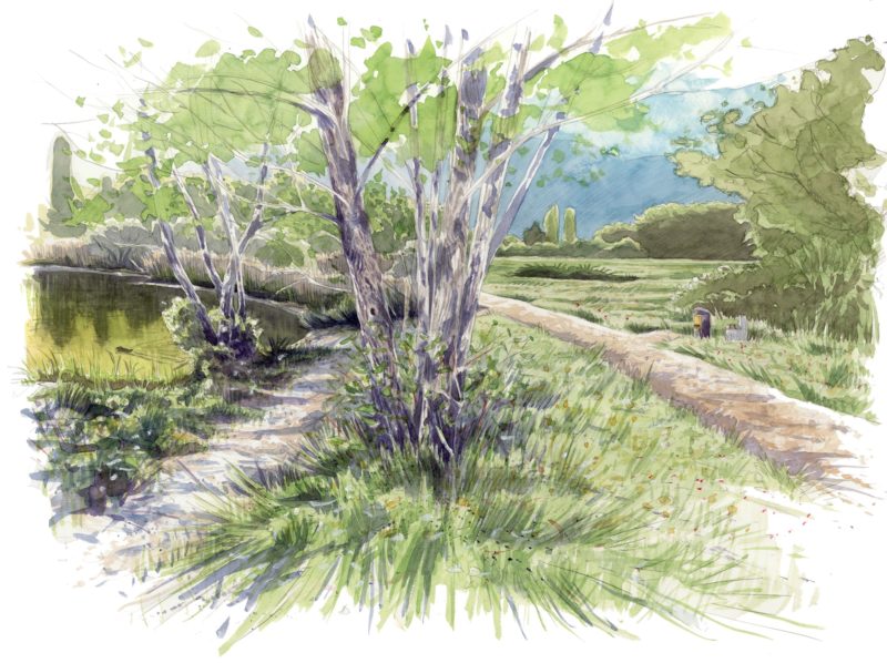« Le bassin de Trévisan Dans les quartiers bâtis, la pluie ruisselle brutalement vers les cours d’eau. Pour atténuer l'impact sur la rivière, on recueille ces eaux dans des bassins végétalisés qui la restituent progressivement à la rivière. »