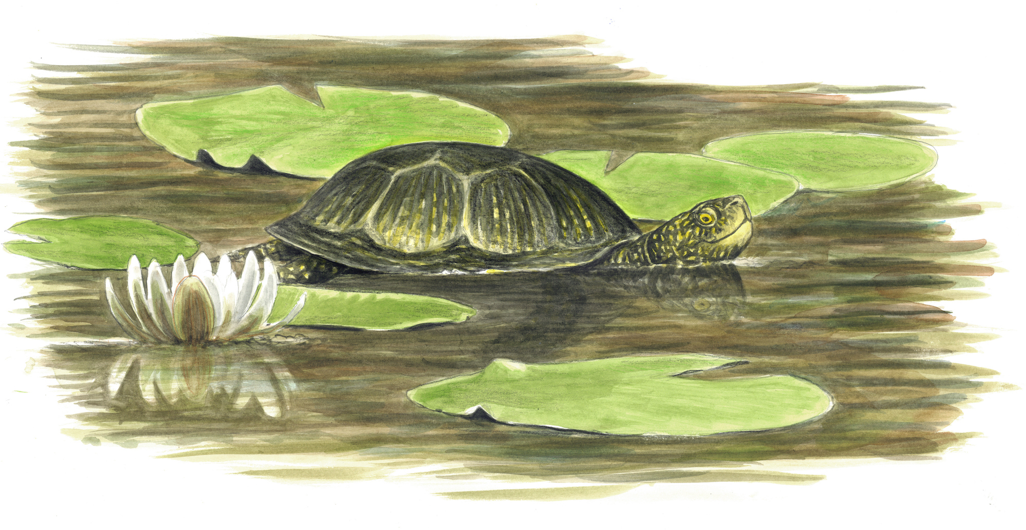Cette tortue aquatique européenne se distingue par les points jaunes qui marquent notamment sa tête. Durant la belle saison, vous la verrez facilement émerger dans les étangs ou se prélasser au soleil.