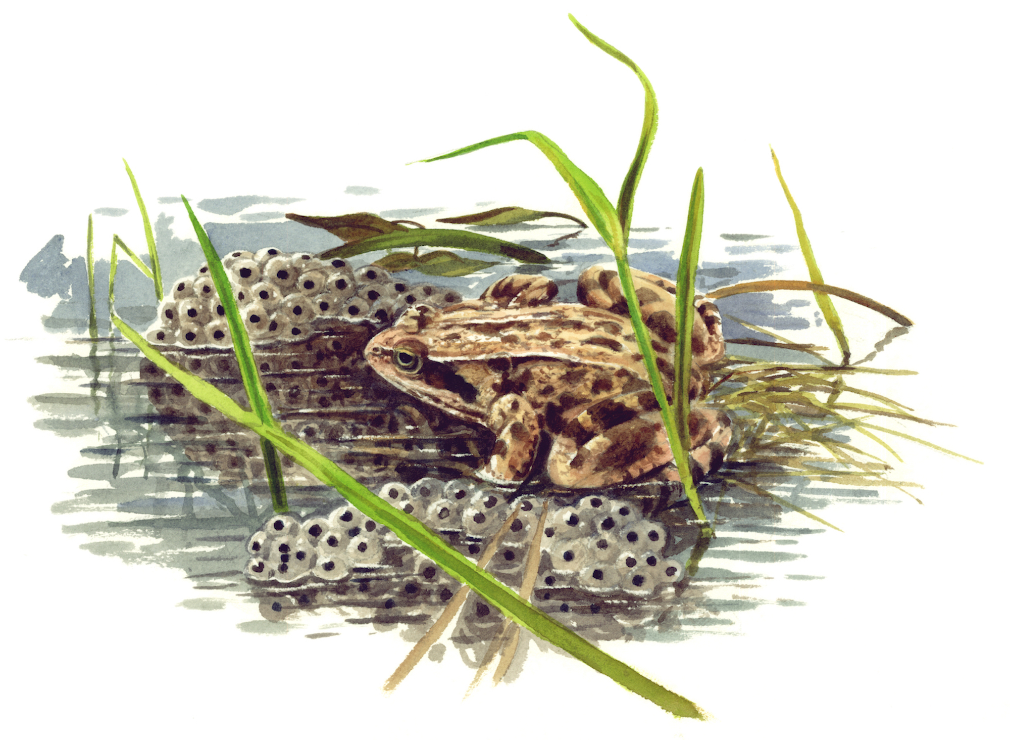 Dès la fin des périodes de gel, les grenouilles rousses viennent en grand nombre pondre des amas d’œufs dans les étangs. La multitude des coassements des mâles produit alors un concert ininterrompu.