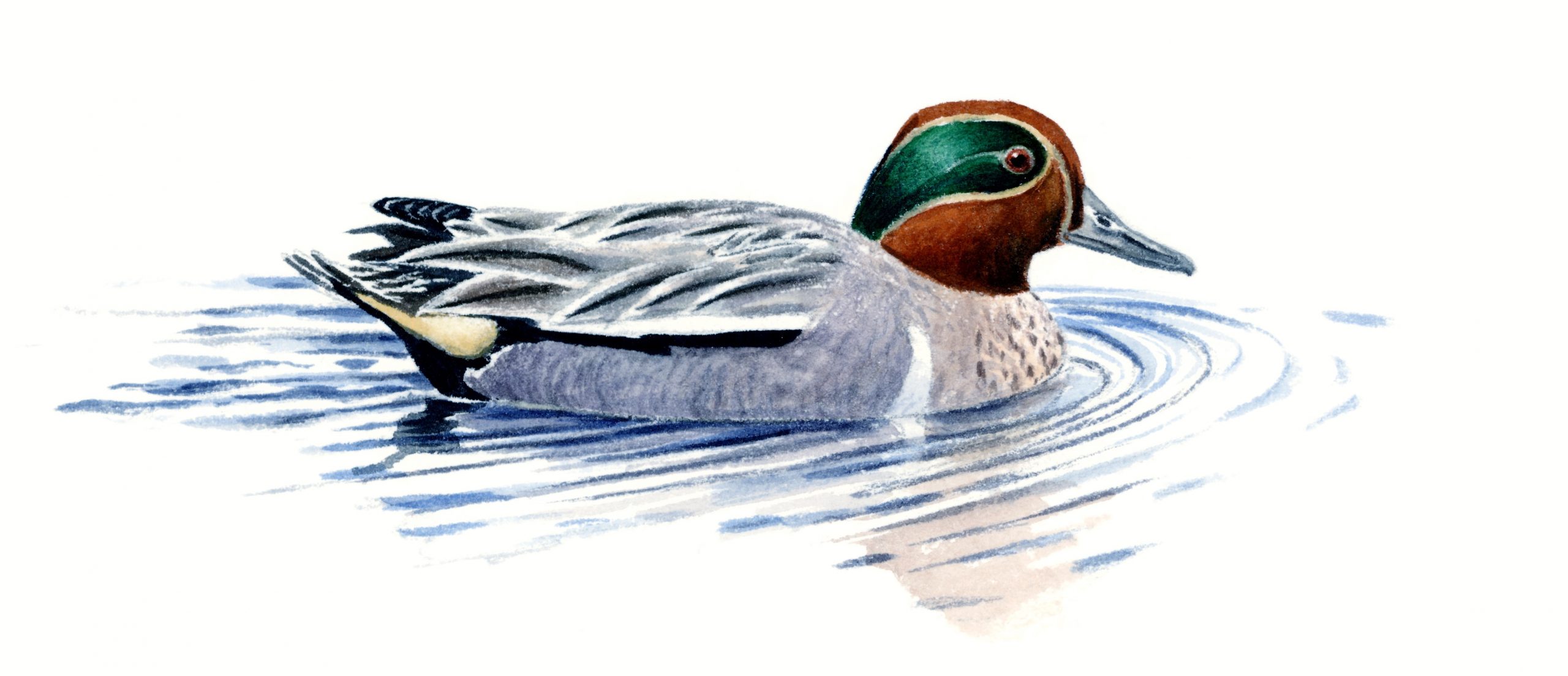 Vive et colorée, la sarcelle d’hiver est le plus petit des canards de surface européens. Elle apprécie les plans d’eau au milieu de la végétation.