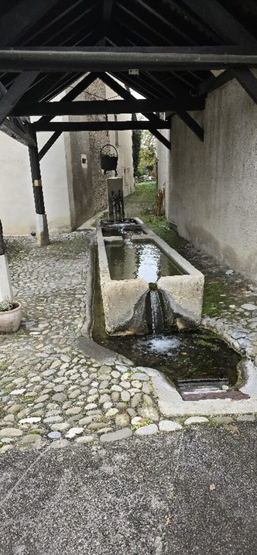Cette fontaine, située en face de l’arrêt TPG, bénéficie toute l’année de l’eau en provenance de la nappe phréatique de la Champagne, comme toutes les fontaines de Sézegnin. En été, cette eau de source est précieuse pour soutenir naturellement les débits de la Laire.