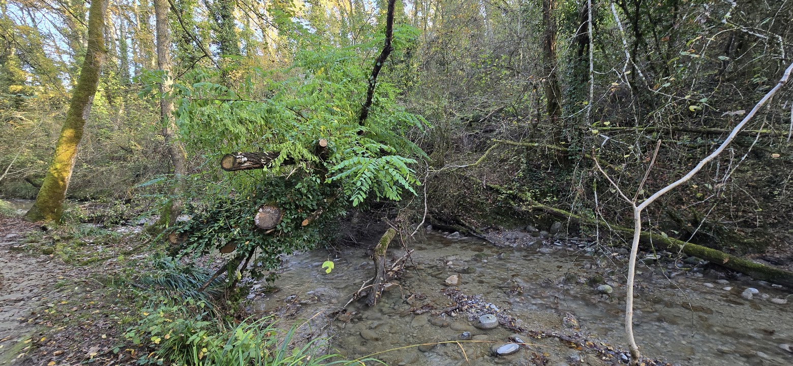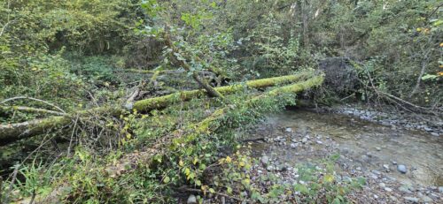 Les aulnes sont des arbres typiques des bords des rivières, leurs racines supportant bien l’inondation. Mais cette proximité est aussi un danger, et une grande crue a eu raison de ces deux grands spécimens, qui fonctionnent aujourd’hui comme des ponts pour la faune.