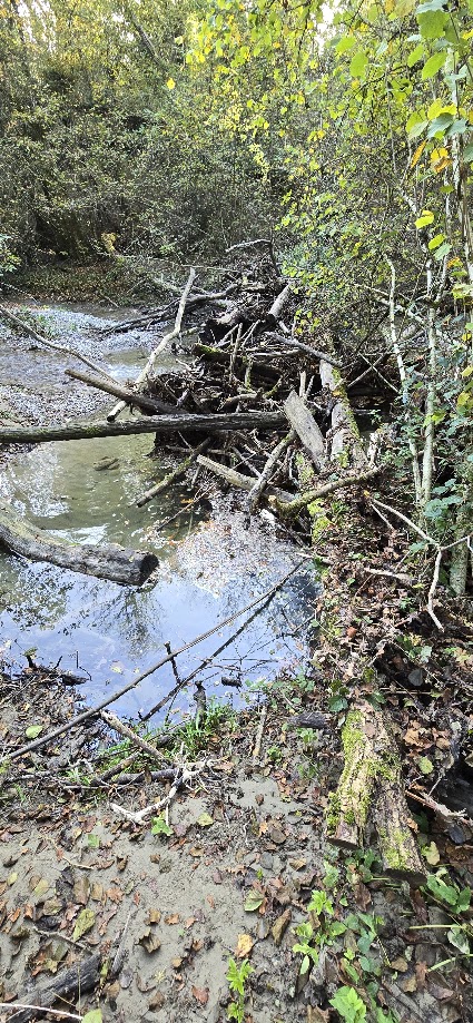 On appelle « embâcles » les accumulations de matériaux déposés par une crue de la rivière. Dans cet exemple spectaculaire, de nombreux arbres arrachés se sont retrouvés bloqués ici, ralentissant le courant et induisant un dépôt de graviers et de sables.