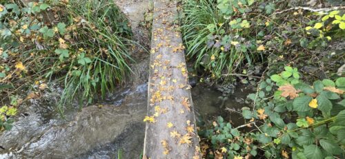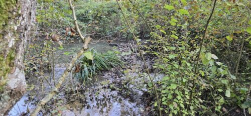 Peut-être découragé par les crues de la Laire, qui ont souvent détruit leurs barrages, un castor a installé un barrage quelques mètres en amont du pont sur la Grave. La petite zone humide ainsi créée illustre bien le potentiel de renaturation de ce rongeur.