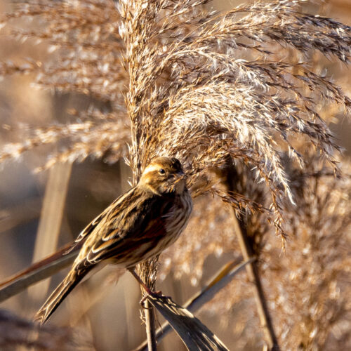 Le bruant des roseaux trouve son bonheur dans la roselière de la Pointe à la Bise. Pour le repérer guettez les cimes des roseaux où vous le verrez se balancer.