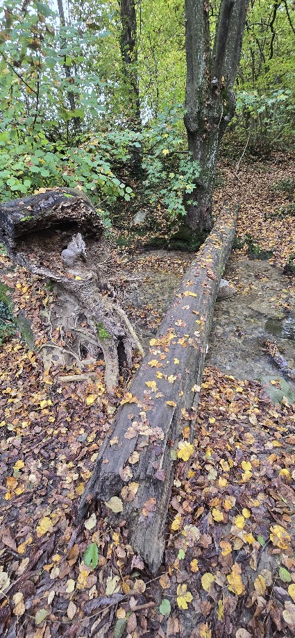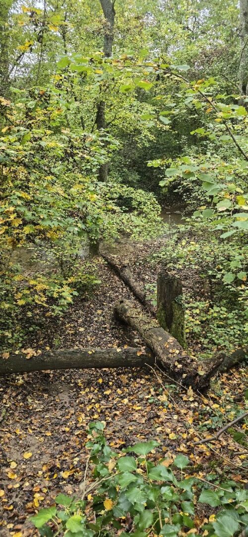 Ici, l’arbre qui est tombé fait un magnifique pont naturel, qu’emprunte les animaux sauvages, écureuils, renards, martre et même blaireau pour traverser la rivière. Mais ne vous y risquez-pas!