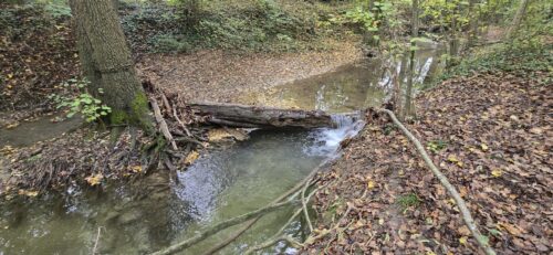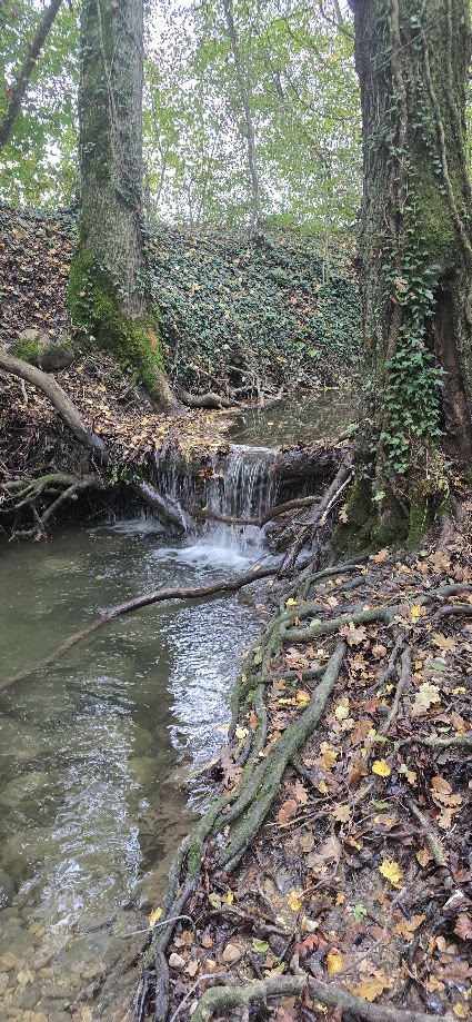 Un arbre s’est effondré et a bloqué la rivière créant un barrage, avec sa cascade. Ces processus naturels sont capitaux pour la diversité des micro-habitats de la rivière et la biodiversité spécifique qui s’y trouve. Ainsi, la zone profonde créée à l’aval de chaque cascade est souvent le dernier refuge pour la faune aquatique (truite, gammares, etc) lors des étiages sévères.