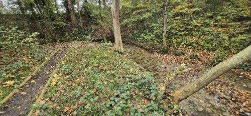La meilleure manière de se préserver contre les dégâts des crues est de rendre de l’espace aux rivières et c’est ce qui a été réalisé ici dans le cadre de la renaturation de 2012. Regardez vers l’amont et vous verrez clairement la rivière principale, dans son lit mineur, et la nouvelle large berge abaissée en rive gauche, qui se poursuit jusqu’au pont, lui aussi agrandi pour laisser passer les eaux lors de conditions exceptionnelles.