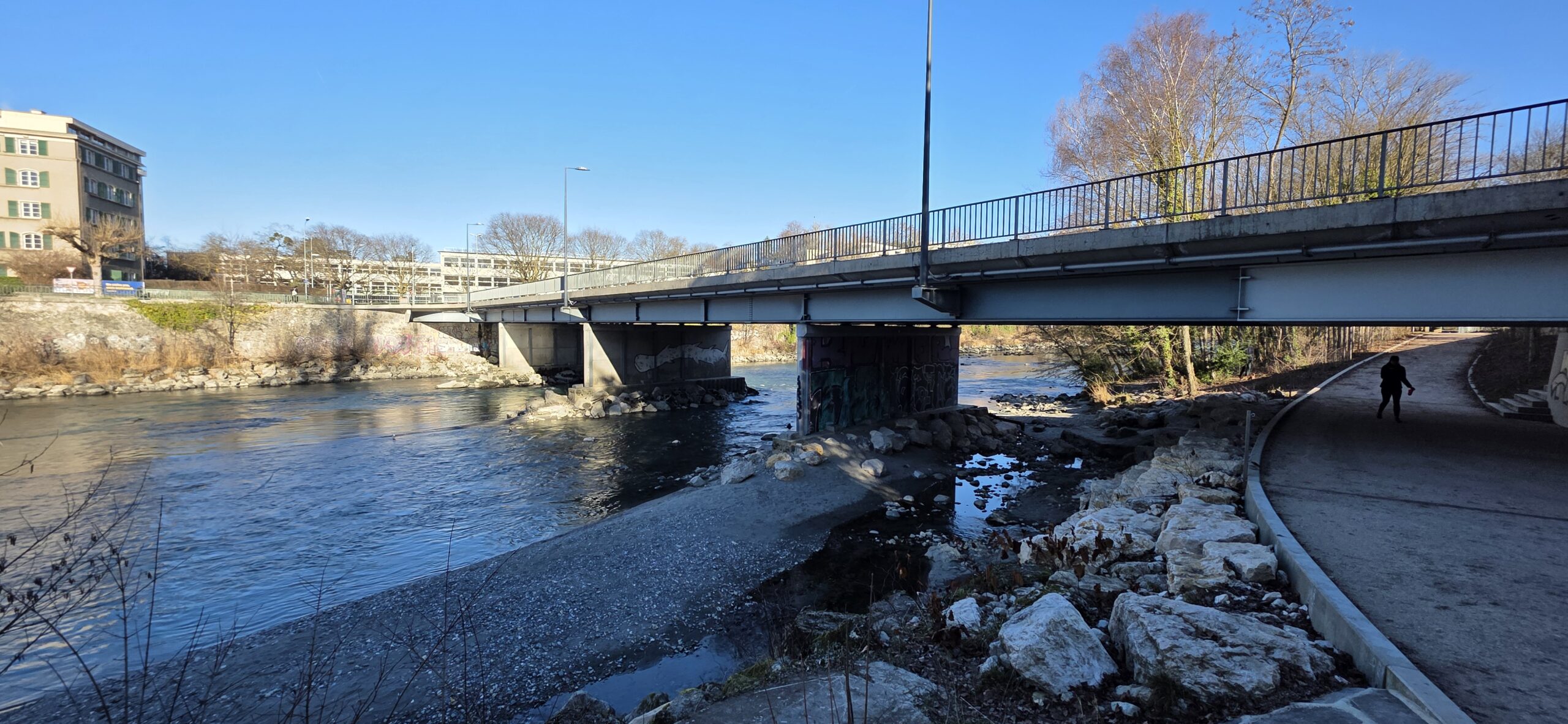 Ce pont donne une superbe vue vers l’amont et l’aval de la rivière et de son cordon de verdure, magnifique exemple de corridor biologique traversant la ville.